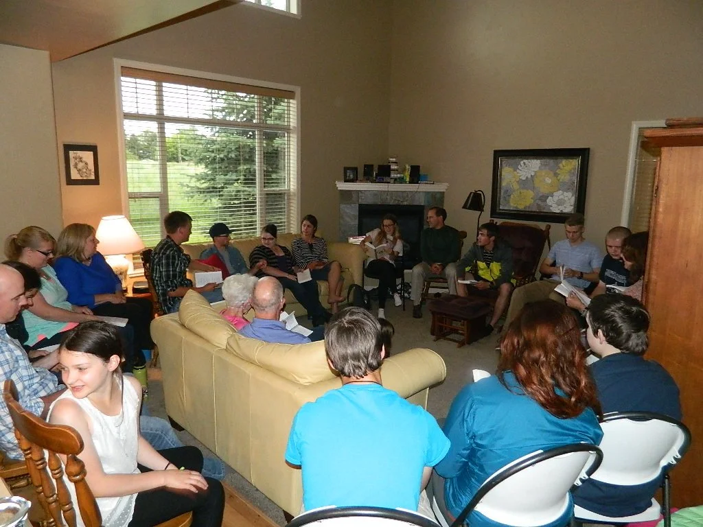 Hosted on Monday evenings at several of the participants' homes, this group often shares a meal before discussing and personalizing the previous Sunday's sermon. At the start of discussion time, around 6:30, some children's songs are sung and some prompts for discussion are also geared for the children. This group is facilitated by many, but you can find out more from the Frees and McNallys.